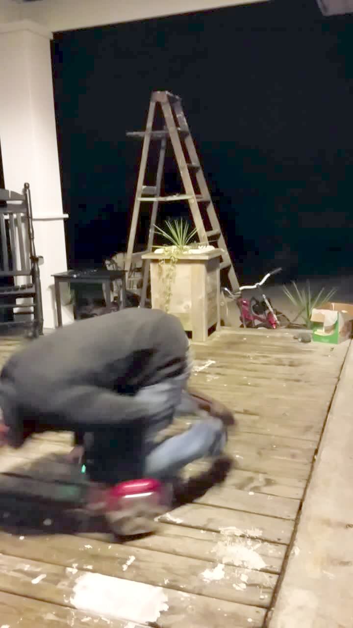 A man dances to music on a deck patio and a board breaks underneath him and he falls down.