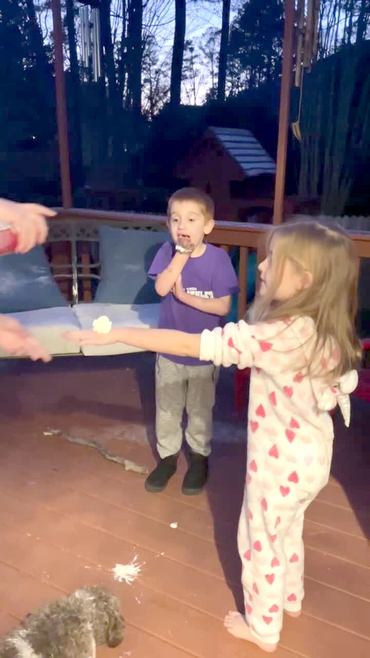 A young girl tries to do the whipped cream challenge but flicks whipped cream onto her dog on accident in a yard.