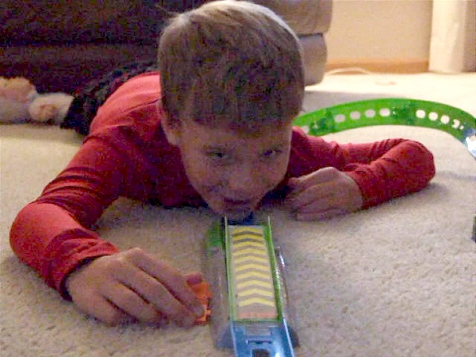 A man in the backyard reverses and drives a toy car while a young girl tries to remember the phone number for the police. The car flips backwards and the dad falls out.