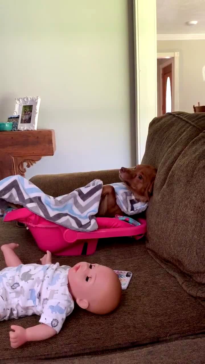 A teen girl feeds a baby. The baby spits on her and the teen falls backwards in her chair. Security footage.