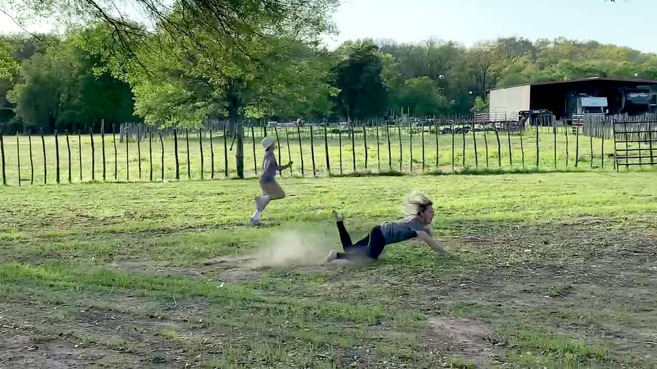 A woman and a young girl run down a sand dune and the girl says "let's go viral!" and falls on her face.