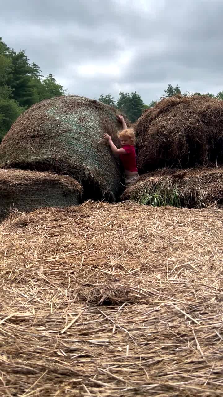 A young girl climbs on hay bales on a farm, then she falls between two hay bales and disappears.