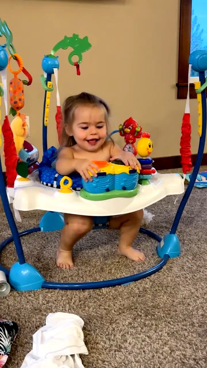 A woman in the living room tells a baby girl to jump in her jumper. The daughter jumps so hard that the jumper falls over and the mom laughs.
