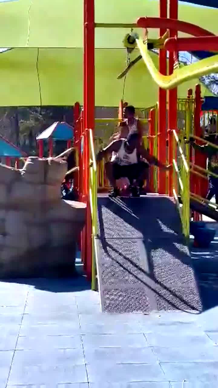 A young girl climbs onto a man's shoulders, and he tries to zip line with her but falls immediately when the handle snaps under their weight (featured talent cleared only: man and young girl on zipline)