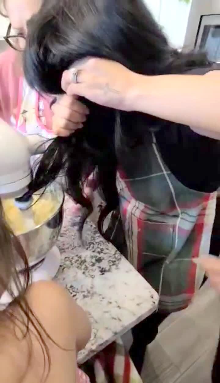 A woman screams in the kitchen as her hair is stuck in a Kitchen-Aid mixer. Someone stops it and they get her hair out of it.