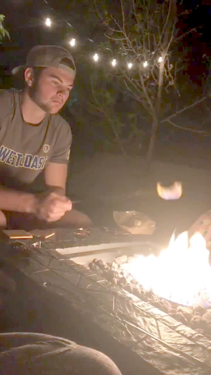 A teen boy screams when a hot marshmallow falls on his knee after he shakes it off of a metal rod when he roasts it over a fire in the backyard.