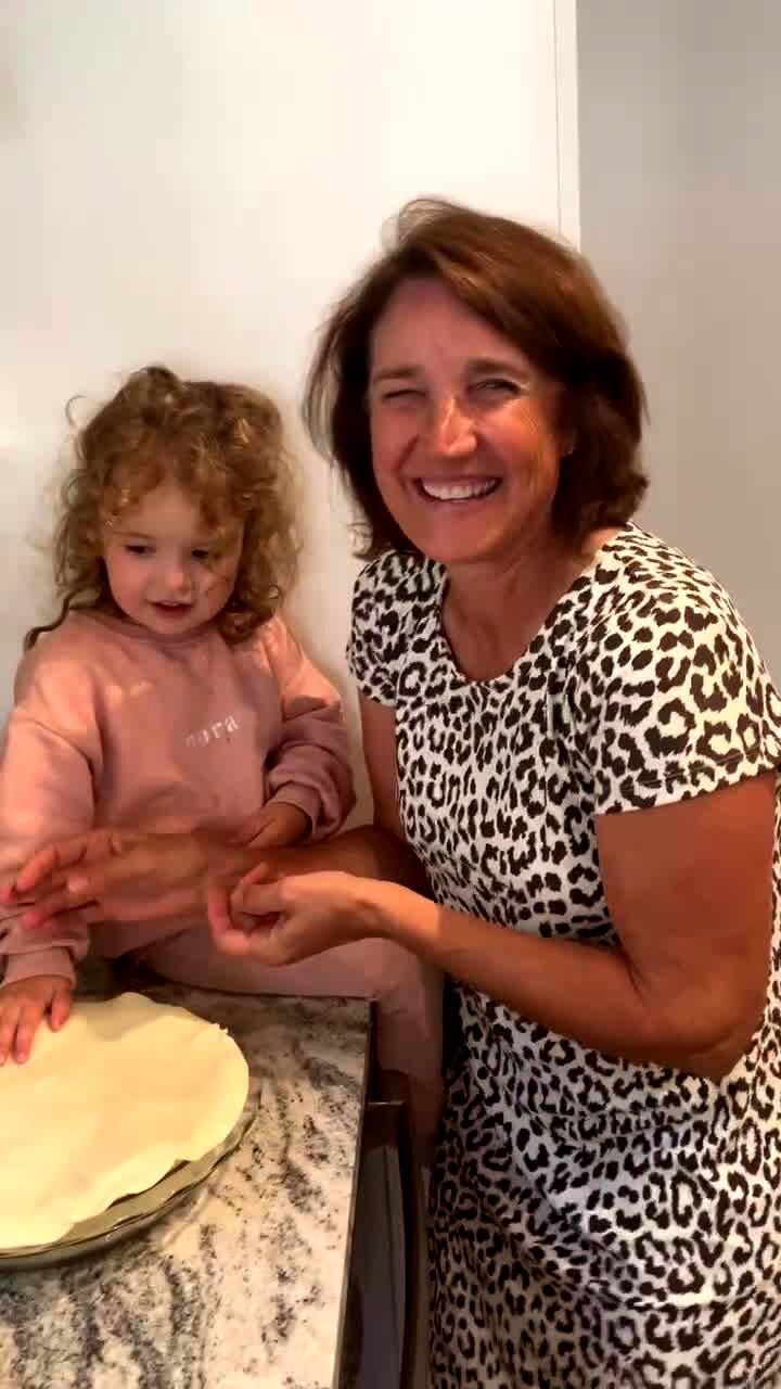 A woman holds a pie crust and a tot girl sits on the kitchen counter and helps her unroll it and she sneezes directly on the dough and the woman laughs but puts it on the pie anyway.