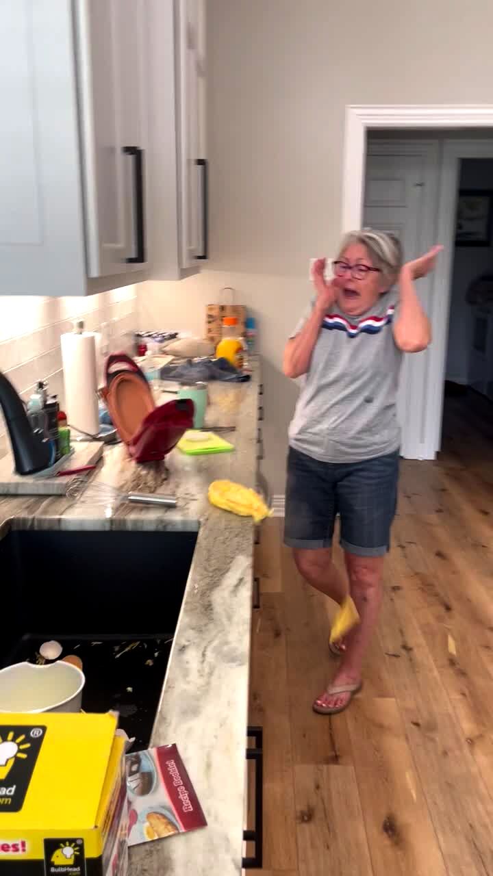 A woman screams in surprise when an omelet explodes out of omelet maker in her kitchen.