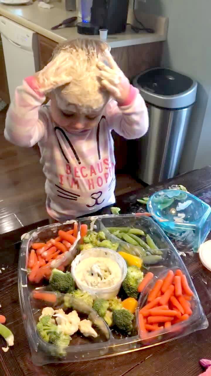 A woman with the camera finds a tot girl at a kitchen table and the tot girl rubs veggie dip all over her face and hair.
