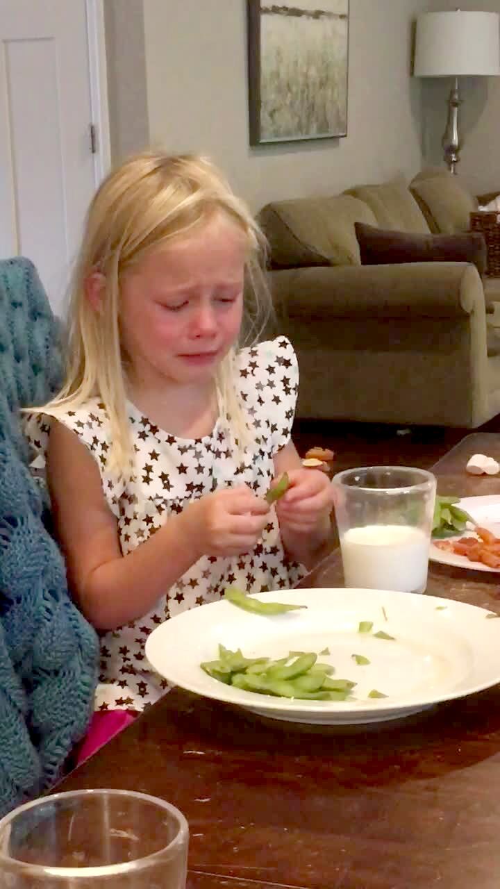 A young girl eats edamame at the kitchen table and cries as she continues to eat then says "it's so good I can't stop eating it".