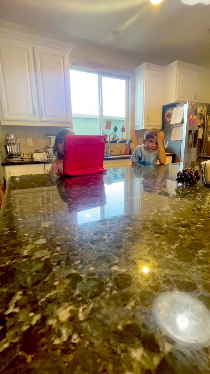 A young boy in a kitchen reads a yogurt label and says the amount of cholesterol is "oh my god." The woman with the camera says it's 0 milligrams (0mg).