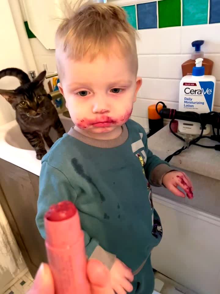 A woman holds a tube of lipstick and walks into the bathroom and a young boy stands on the toilet with lipstick all over his hands and face and she asks him how it tasted and he says "icky" and makes a sad face.