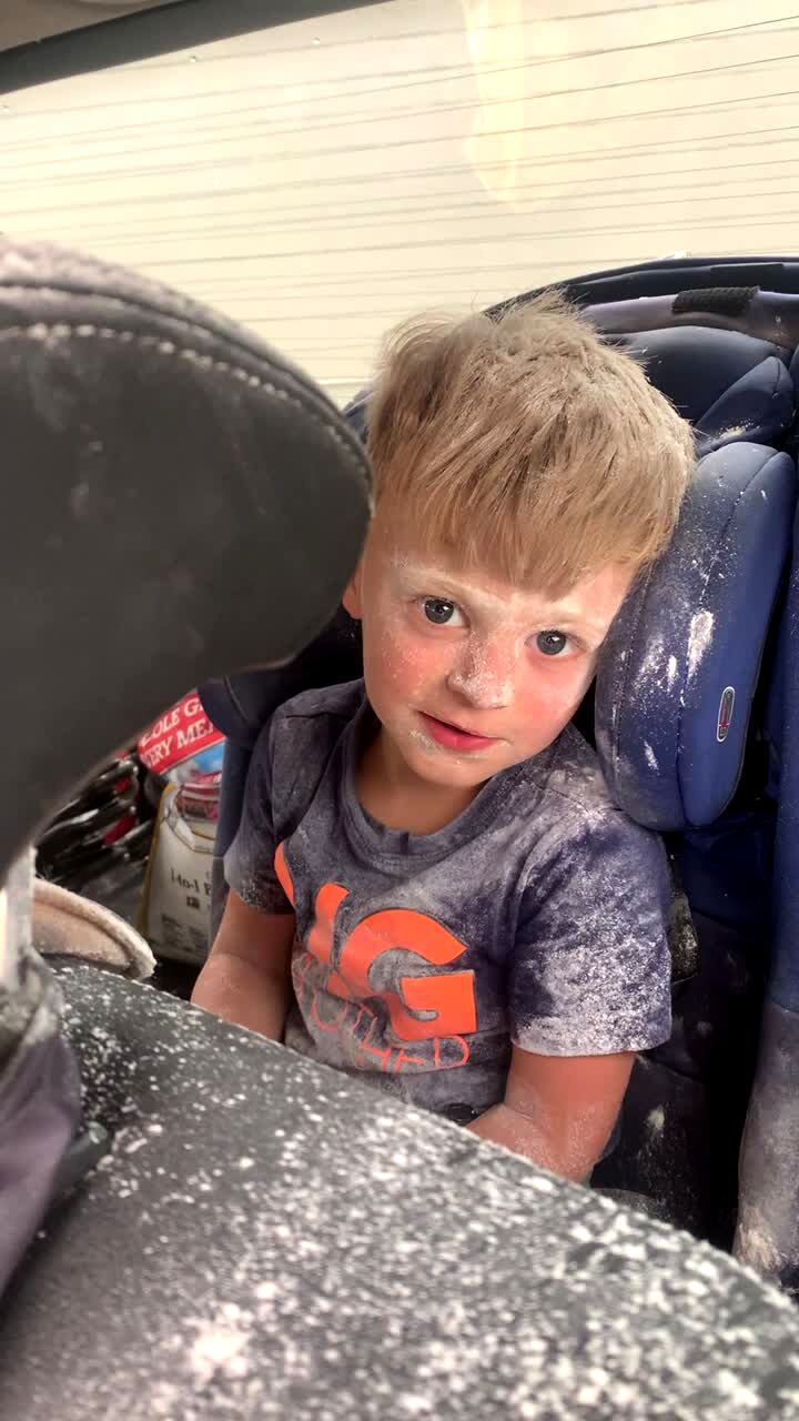"Three Rows of Oh-No's" When a mom turns her back on her vehicle to talk to a friend, a young boy makes a mess with a bag of flour and covers the seats and other children in the car with it. They boy says, "mama, I was just cleaning your car."