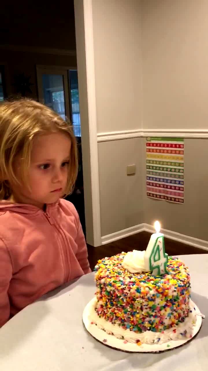 A family sings happy birthday to a tot girl in a kitchen. She interrupts them and says "I was expecting a unicorn cake" her mom tells her that they were out, then she sighs and says "ugh fine" in a kitchen.