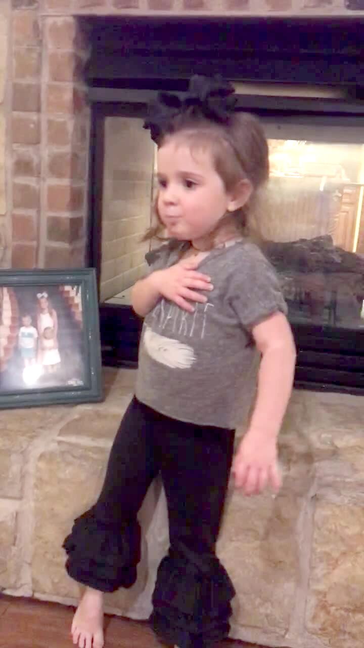 A tot girl says the Pledge of Allegiance, and after she says "for which it stands" she stops and says "mommy, I do not like witches."