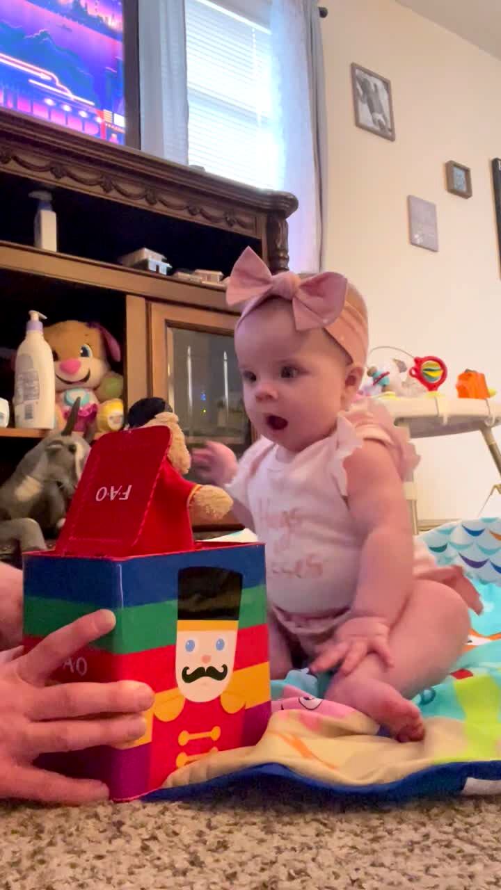 A baby girl is wide-eyed with shock when she gets startled by a Jack in the Box toy on a living room floor.