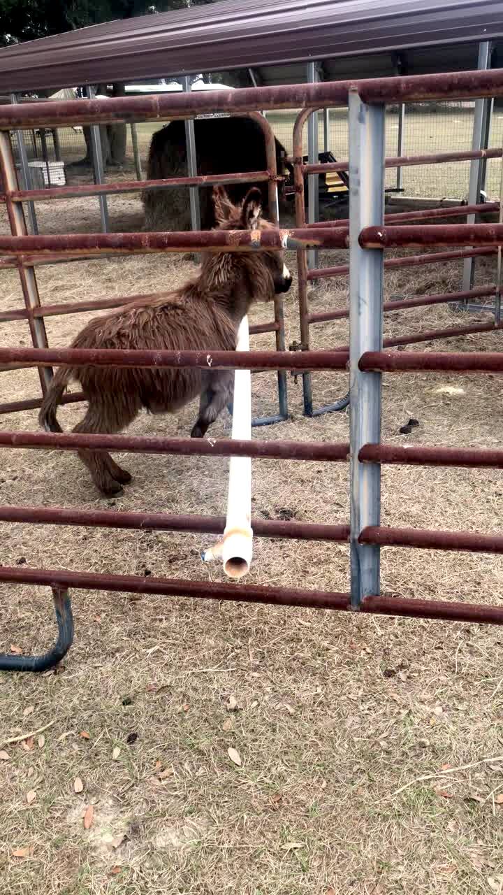 A miniature donkey jumps over a pole and falls down on a farm, then a second donkey copies it and also falls down.