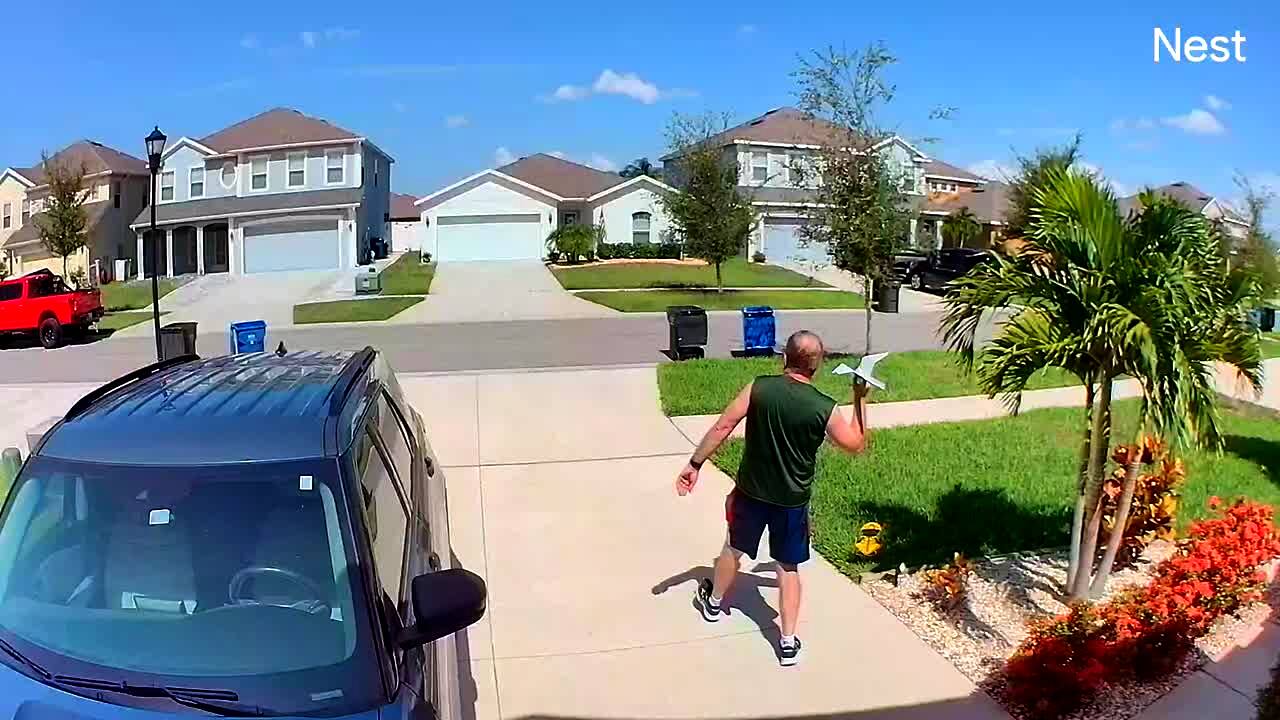 A senior man throws a paper airplane from his driveway, then laughs when it lands in a recycle bin at the end of the driveway. Security footage.