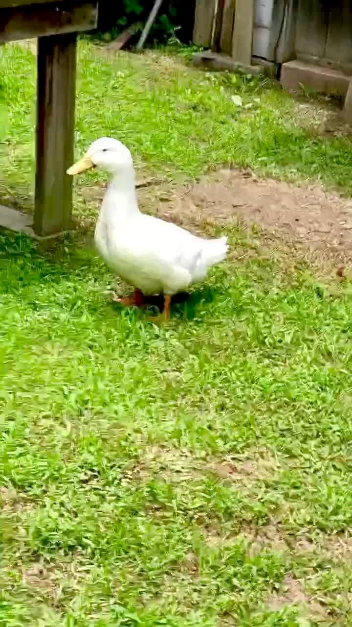 A woman tells duck puns to a duck and it quacks in response in a yard.