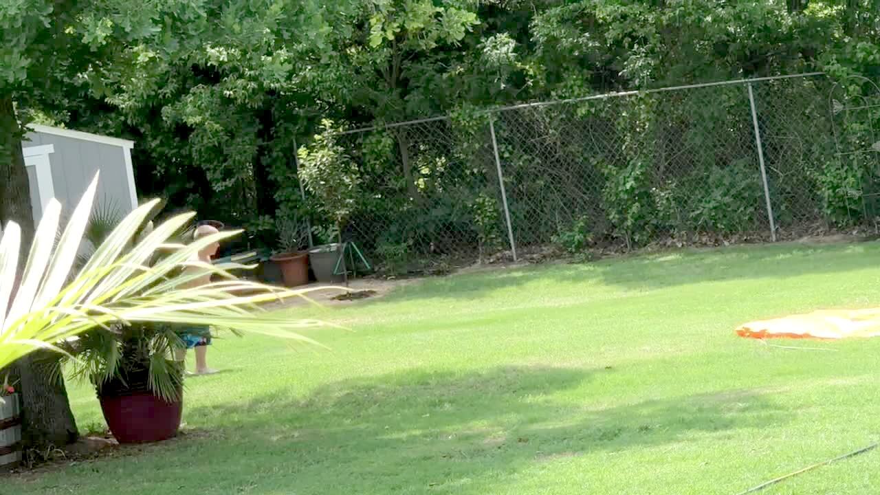 A dad tries to control his laughter, as his two boys race across a yard on their balance bicycles but the younger one topples forward and face-plants.