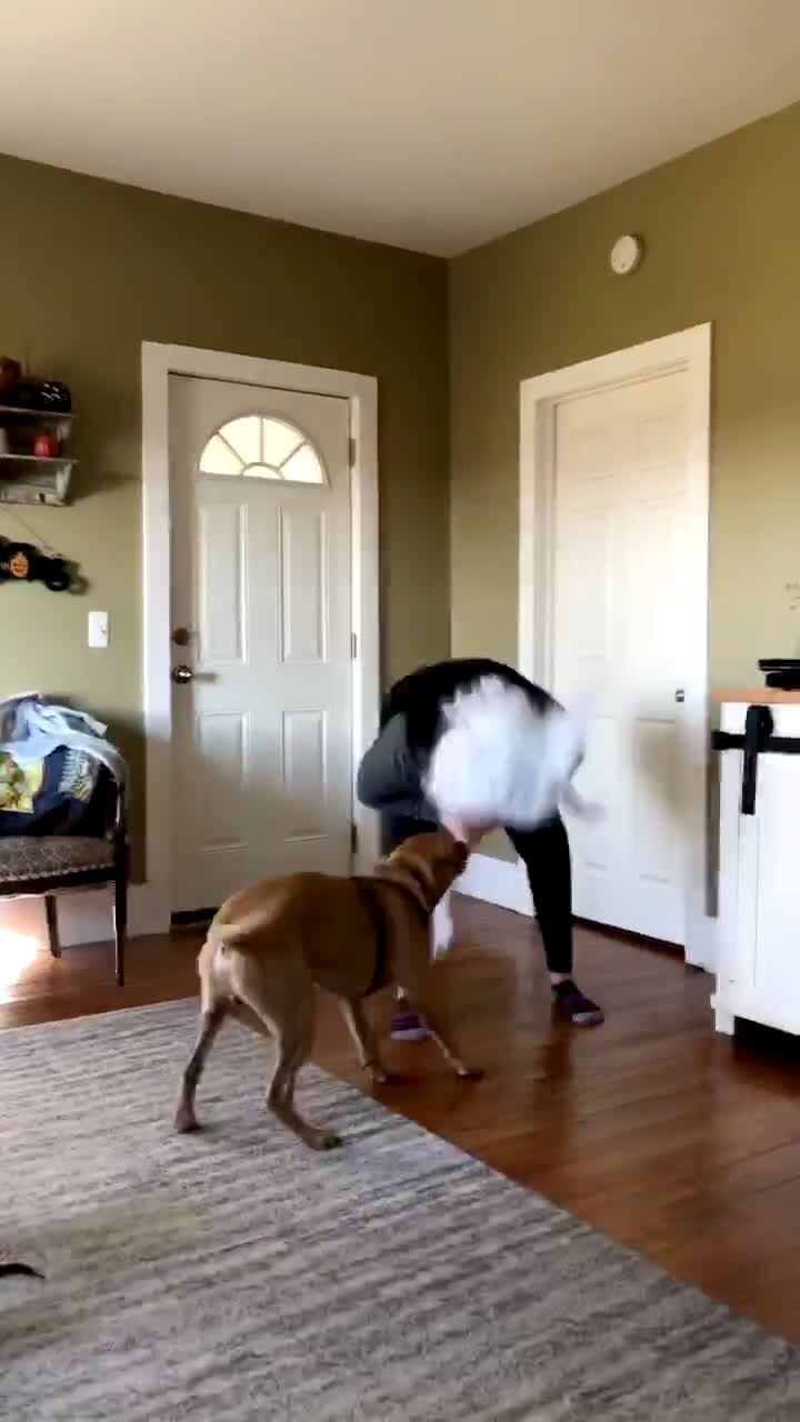 A man throws a toy for a German Shepherd dog and hides under a blanket in a living room, then the dog runs back and forth through the house with the toy in his mouth.