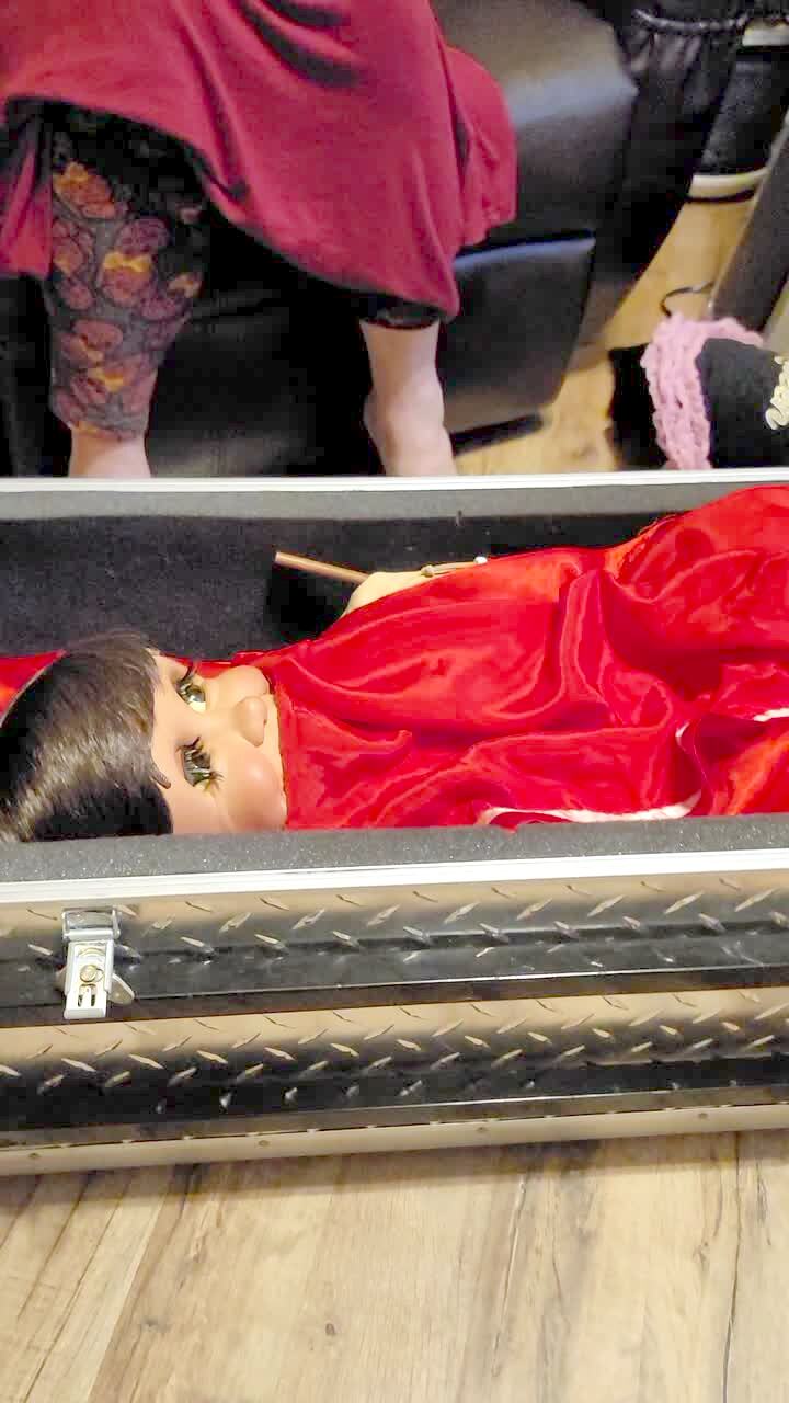A small Yorkie dog sniffs a blanket in a box and a woman pulls the blanket back to reveal a ventriloquist dummy and the dog jumps and falls out of the box in the living-room.