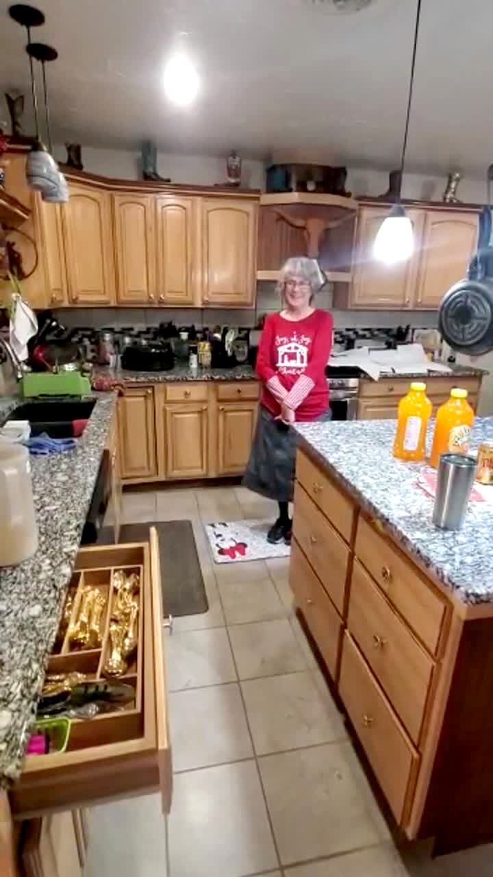 A man and a woman trick a senior woman into thinking that the silverware drawer can be opened and closed through voice activation. Finally, a young boy comes out from under the cupboard and reveals he was behind it.