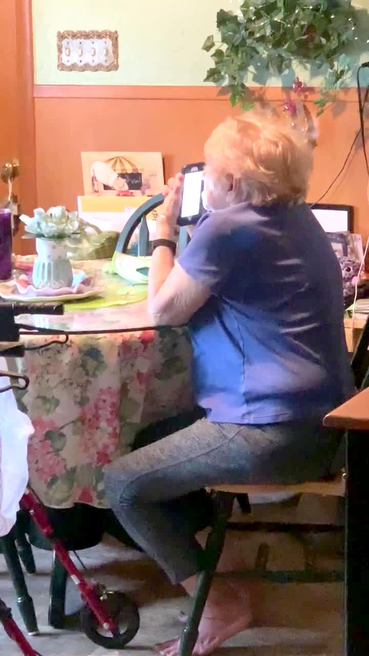 A young boy's toy spider jumps into a senior woman's coffee cup in a dining room, and she screams while the young boy yells "no."
