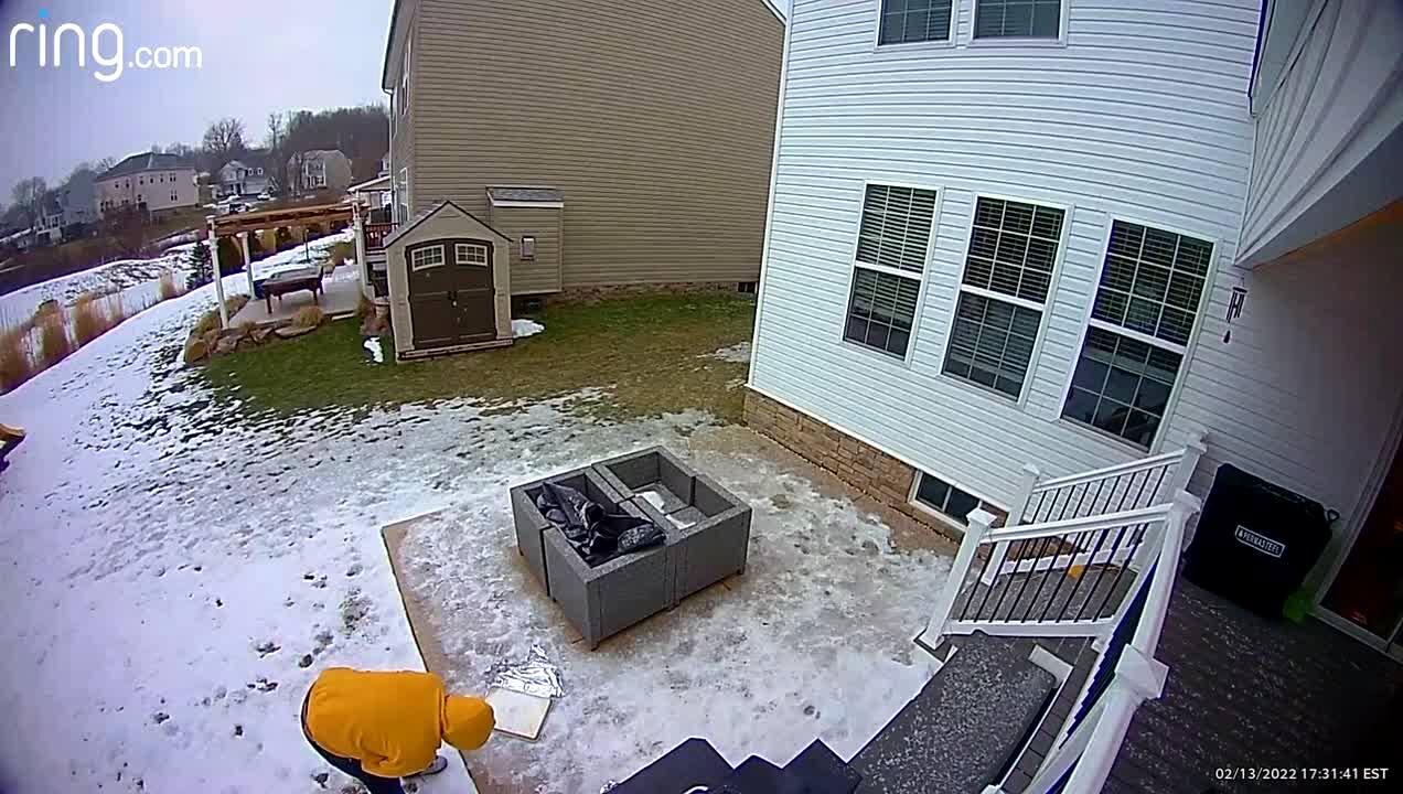 A snow blower hits a cord, flies out of a man's hands on a driveway, and crashes into the house. Security footage.