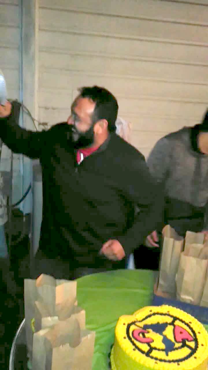 A man uses a plate to block his face when a teen boy tries to smash his head down in to his birthday cake as he leans over it in the backyard.