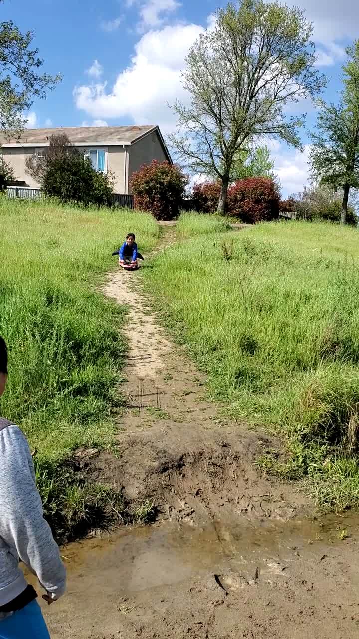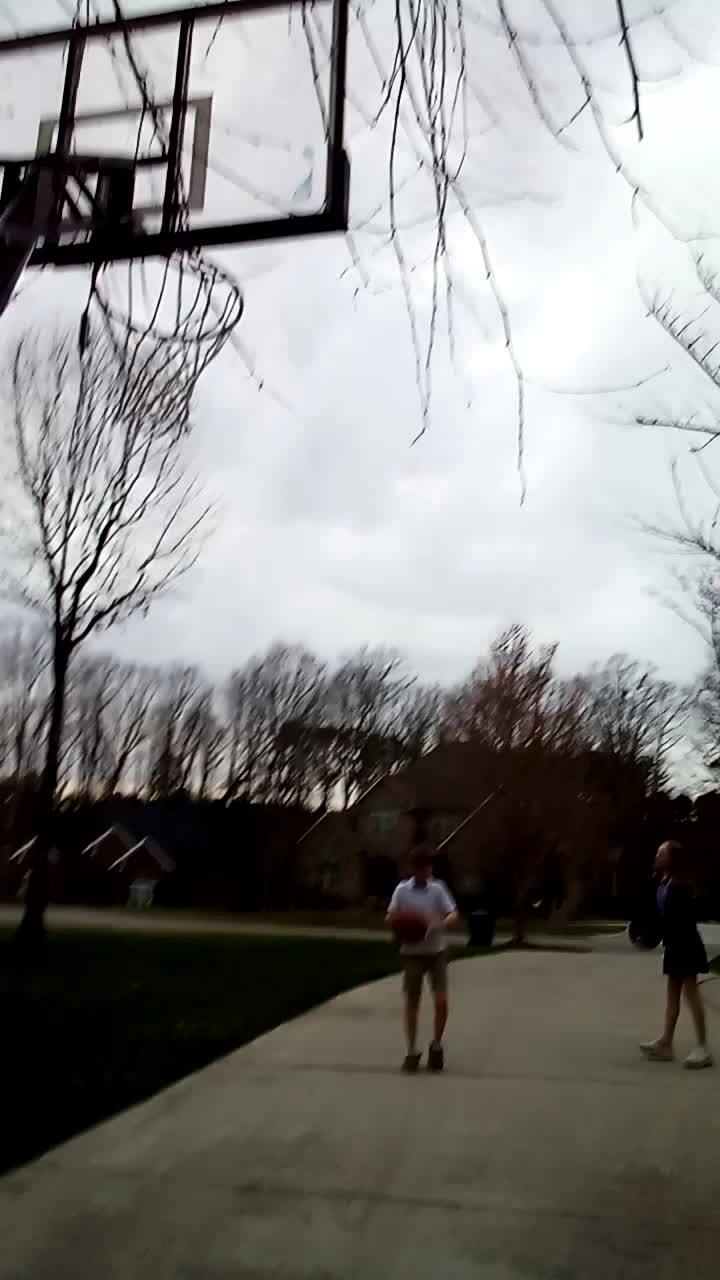 A teen girl stands on her back porch when a golden retriever pushes her from behind with its paws. As the dog runs away the girl maneuvers herself in the air so that she doesn't fall on a a metal pole. Security Footage.