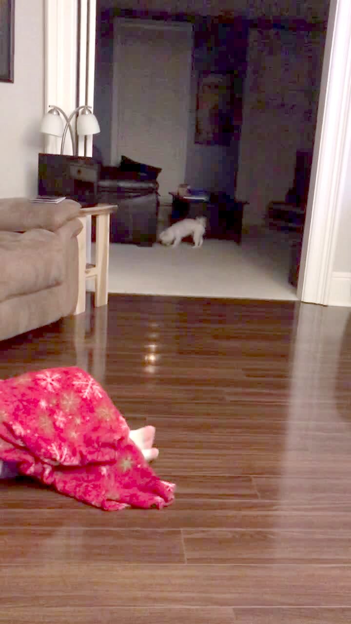 A dog whines with a cat's tail over her eyes in a living room, then the cat moves, and she stops.