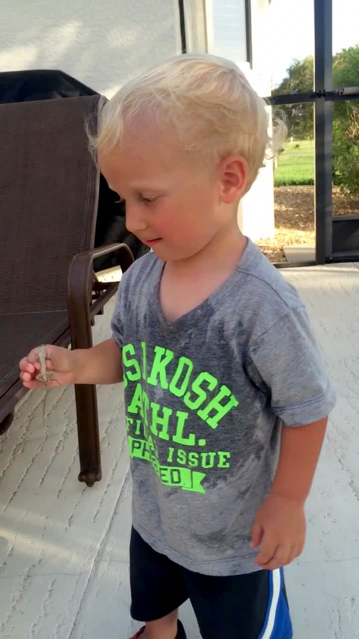 A tot boy holds a lizard outdoors. His dad tells him to kiss it, he does, and it bites him.