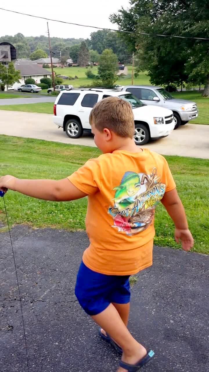 A boy hyperventilates while trying to throw a toy tied to his loose tooth outdoors to pull it out. The boy repeatedly makes halfhearted attempts and complains at how much it hurts.