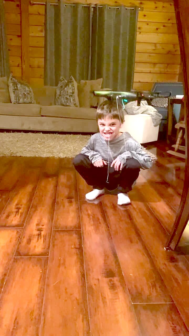 A young boy has his tooth tied to a drone and it flies away and pulls the tooth and the boy screams in the dining-room.