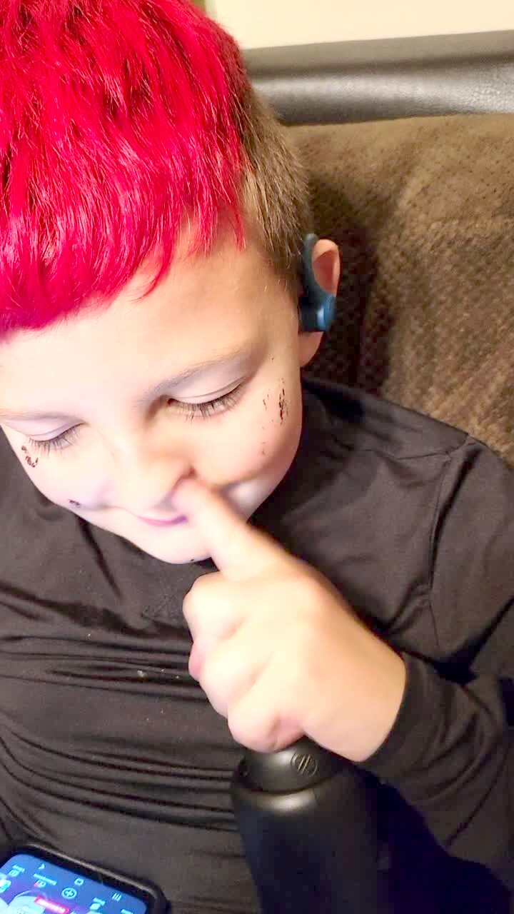A young boy has his hand on top of a massager gun then picks his nose and makes his nostrils vibrate.
