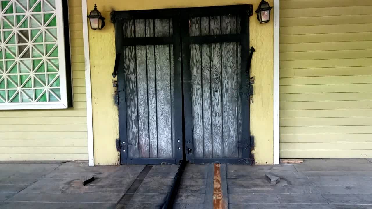 A man jumps and throws his phone in fear when he sees a snake skin that hangs on light on porch.