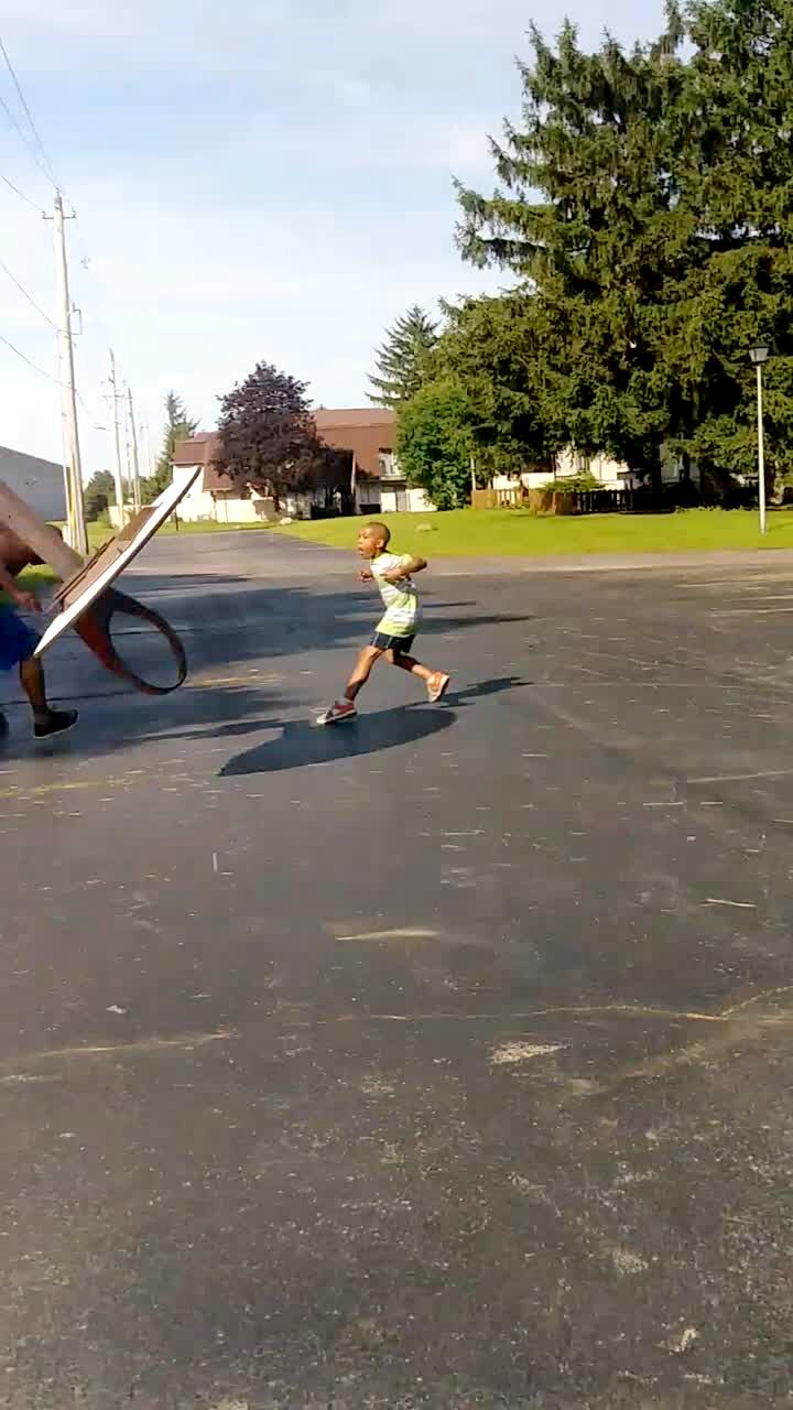 A young boy tosses a football back and forth with his dad in a basement. When he says, "tough guy," the ball bounces back and hits him in the head as he drops to the floor. Security footage.
