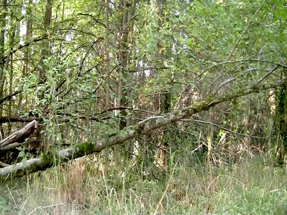 Man tries to jump from tree branch to a fallen tree trunk in the woods by a lake. He slips and hits his arms & back on the trunk, lands at the bottom of a small hill.