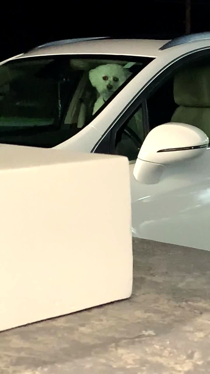 A woman in her car sees a Pug with a coffee cup lid in his mouth in the car next to her. As she talks to him, another dog pops up and barks at the woman which startles her.