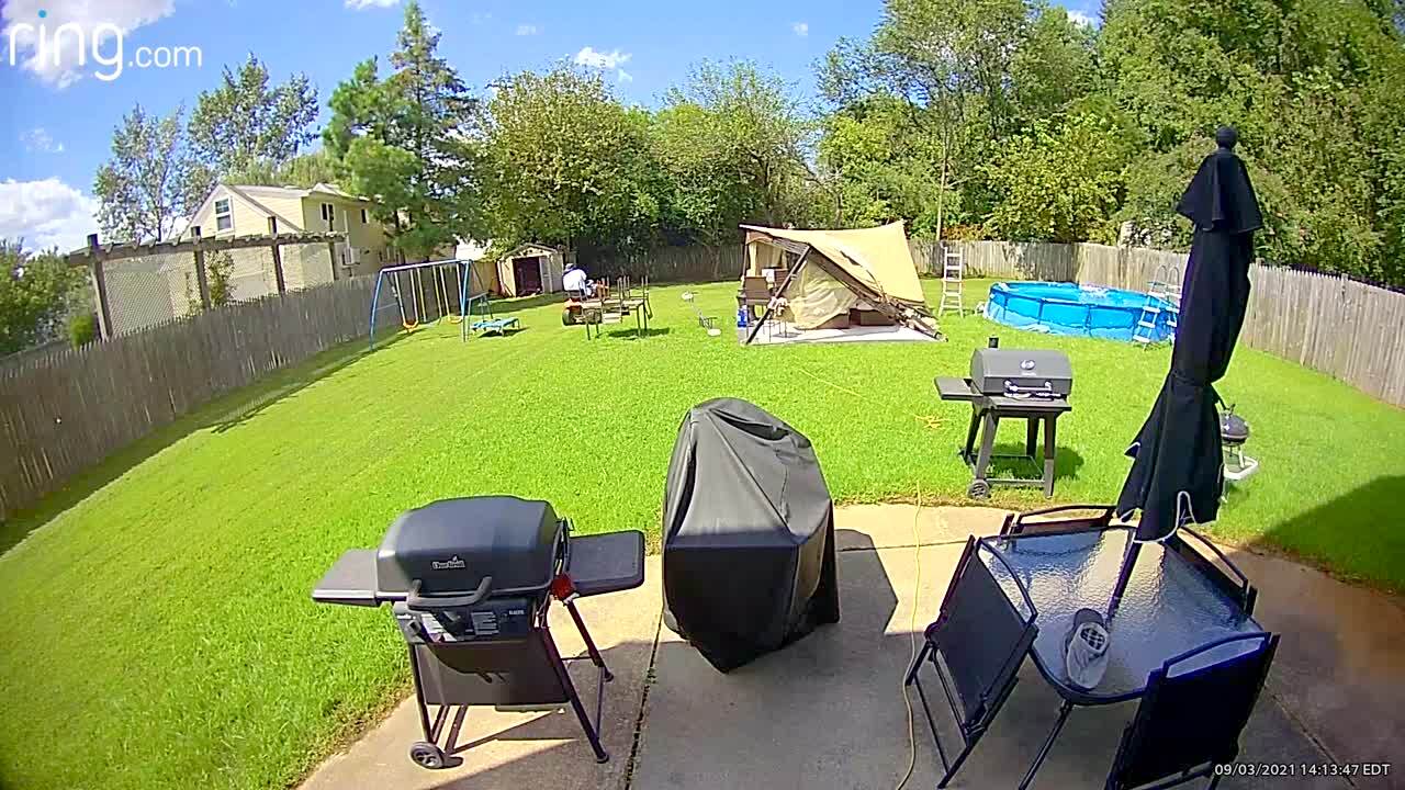 A man yells while he trips and falls next to a ladder in a yard, then a woman comes out of a trailer and asks him where he is, but she looks in the wrong direction. Security footage.