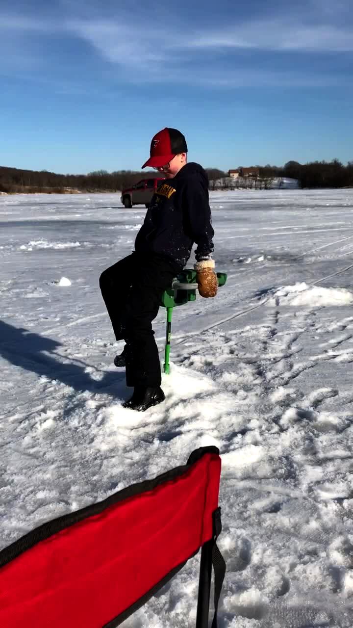 A young boy sits on top of an ice auger, then it spins uncontrollably and he falls into winter snow.