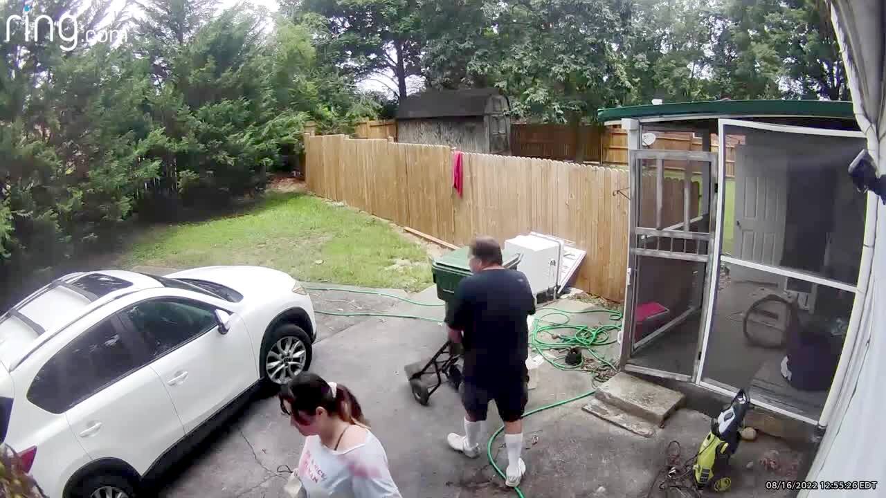 A man closes a dishwasher to move it onto a dolly in a backyard. Then he suddenly yells "bees, bees, bees!" and runs away, waving his hands. Security footage.