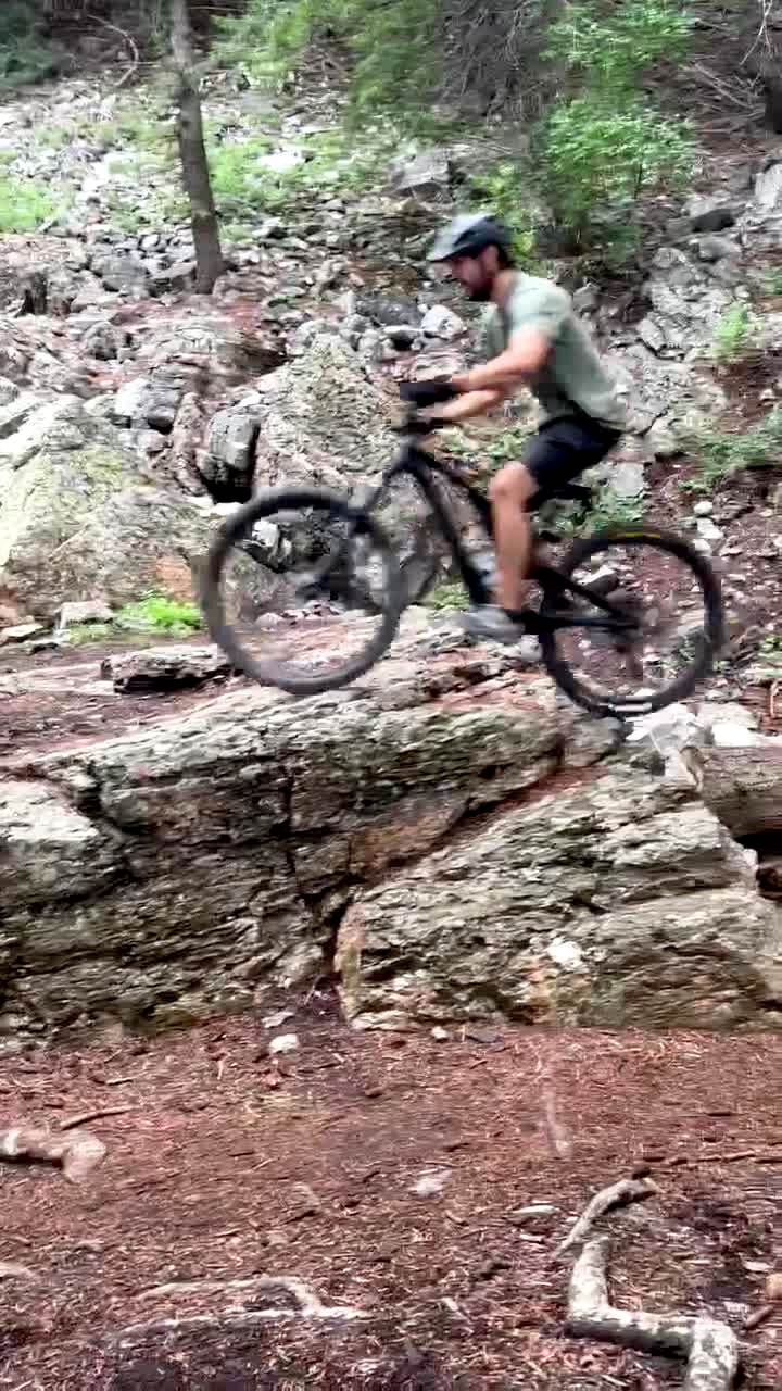 A man rides a bicycle over a tree limb in the woods. Then another man attempts to do it and the wheel of his bicycle gets stuck. He falls.