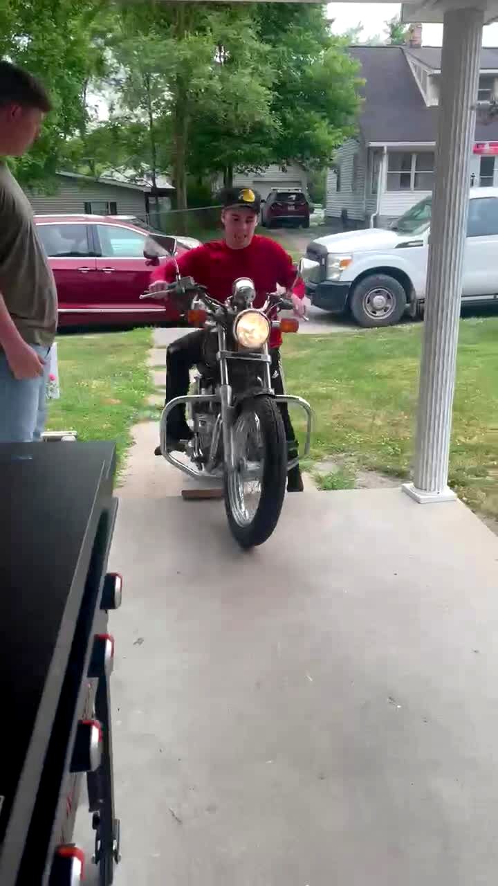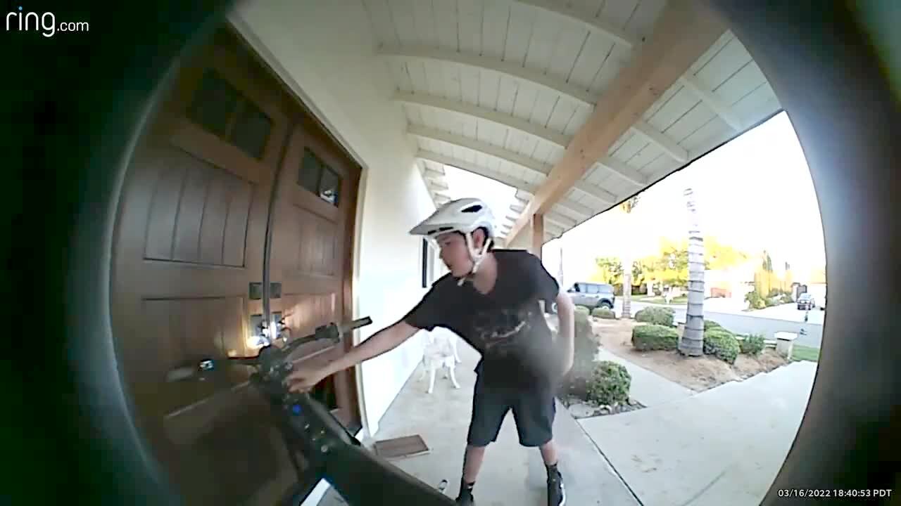 A teen boy throttles an electric bike / motorcycle and it hits the front door. Security footage. Ring.com.