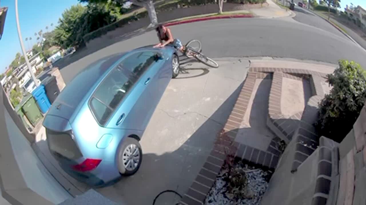 A woman rides a bicycle down a neighborhood street when she fails to brake and crashes into a parked car and lands on its hood. The bicycle flips onto her back. Inappropriate language. Security footage.
