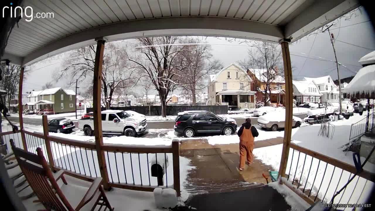 A man is sweeping a driveway when the broom part literally flies off the handle and hits a car parked on the street. Security footage.