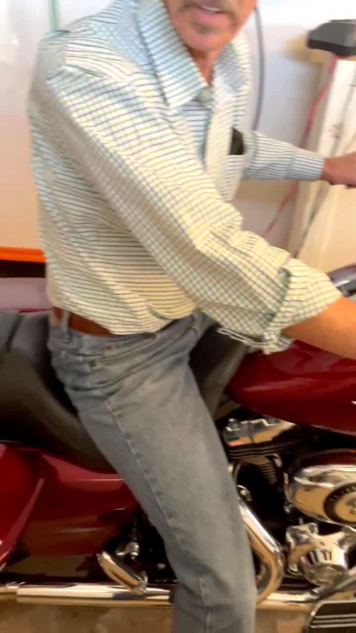 A man sits on a motorcycle in a garage and appears to leave the engine idle. The camera turns to show that a young boy blows into his elbow to make a fake motorcycle noise.
