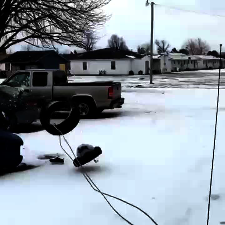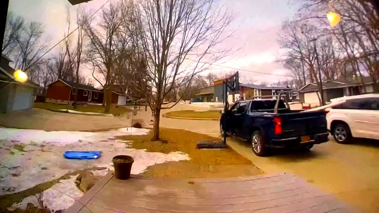As a man man starts his truck, the truck catches the net on a portable basketball hoop. The hoop and stand all fall onto the truck as it's dragged down the street. Security footage. No audio.
