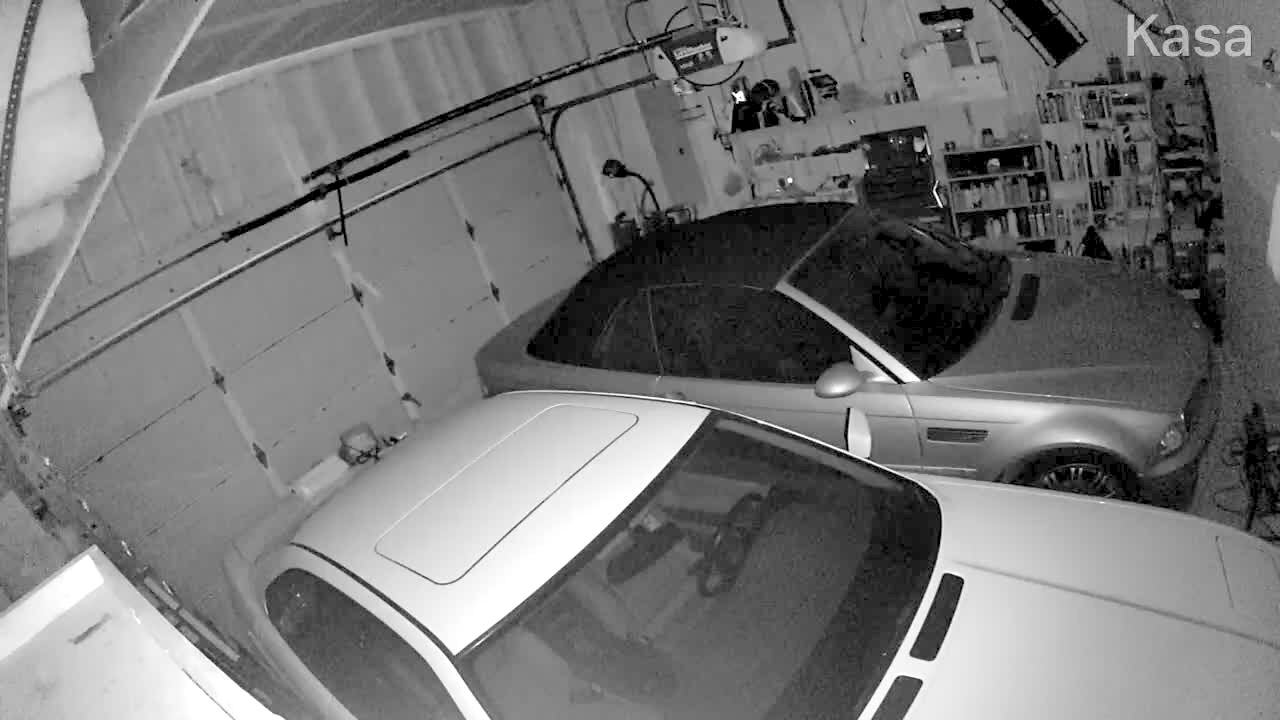 A cat falls through the attic ceiling and into the garage. Night time security footage with loud audio.